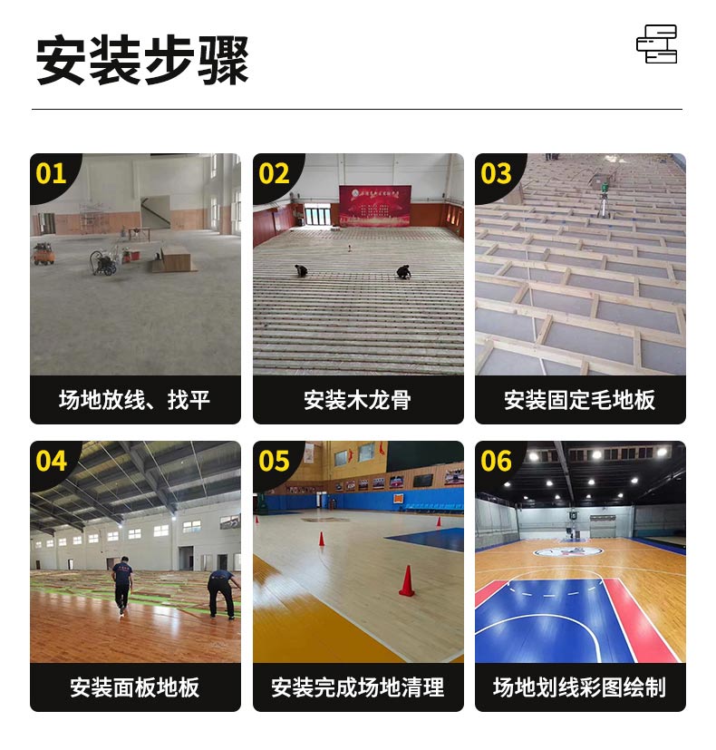 专业篮球场木地板,参照德国DIN标准,结构标高100mm完全满足运动木地板的保护功能、运动功能、技术功能,适用于各类教学训练、表演等。